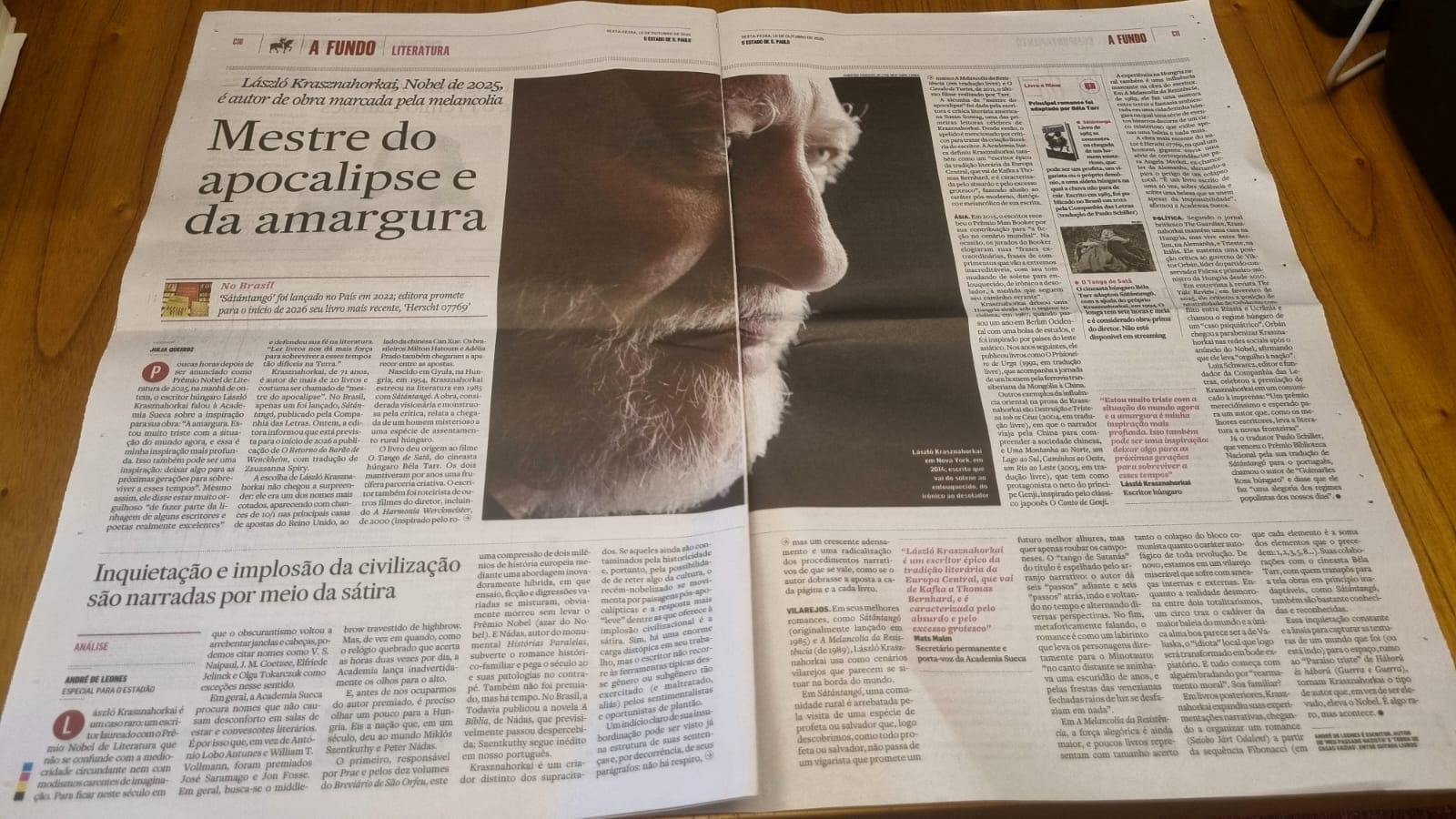 László Krasznahorkai é um caso raro: um escritor agraciado com o Nobel de Literatura que não se confunde com a mediocridade circundante ou com os modismos carentes de imaginação. Para ficar neste século em que o obscurantismo voltou a arrebentar janelas e cabeças, podemos citar V. S. Naipaul, J. M. Coetzee, Elfriede Jelinek e Olga Tokarczuk como exceções nesse sentido. Em geral, a Academia Sueca procura por nomes que não causam desconforto em salas de estar e convescotes literários. É por isso que, em vez de António Lobo Antunes e William T. Vollmann, premiaram José Saramago e Jon Fosse. Em geral, eles buscam o middlebrow travestido de highbrow. Mas, de vez em quando, como o relógio quebrado que acerta as horas duas vezes por dia, lançam inadvertidamente os olhos para o alto.